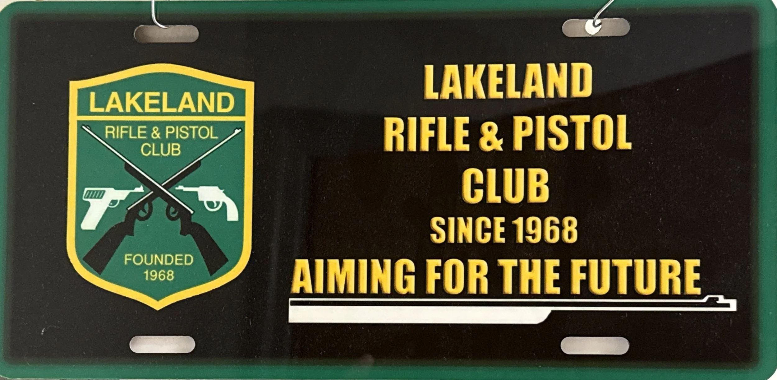 Black sign with yellow and green emblem for Lakeland Rifle & Pistol Club, featuring crossed rifles and two pistols, stating it was founded in 1968 and aiming for the future.